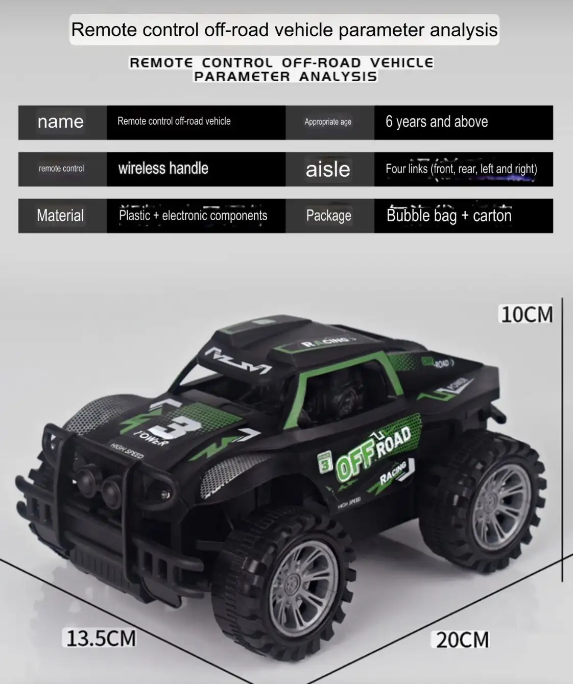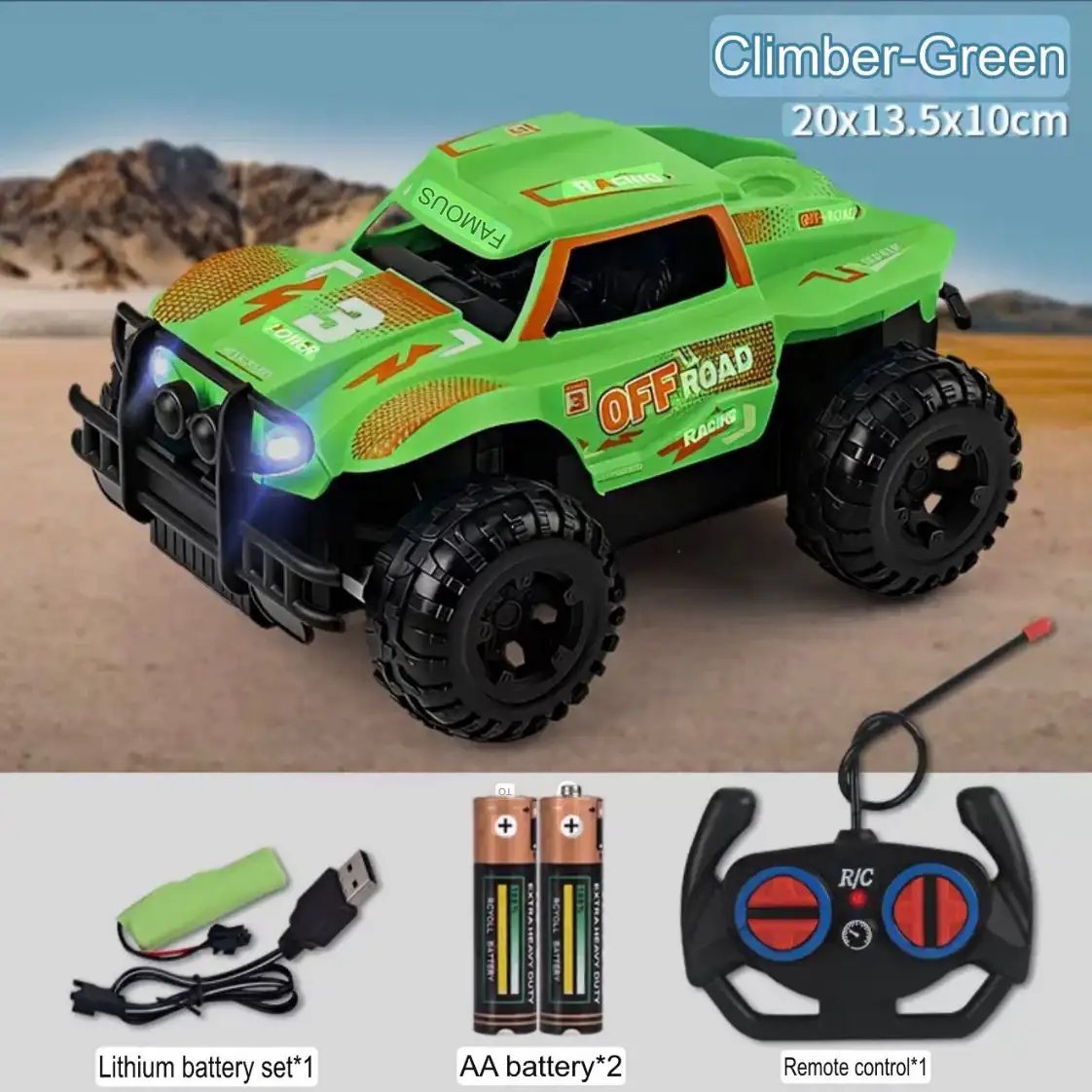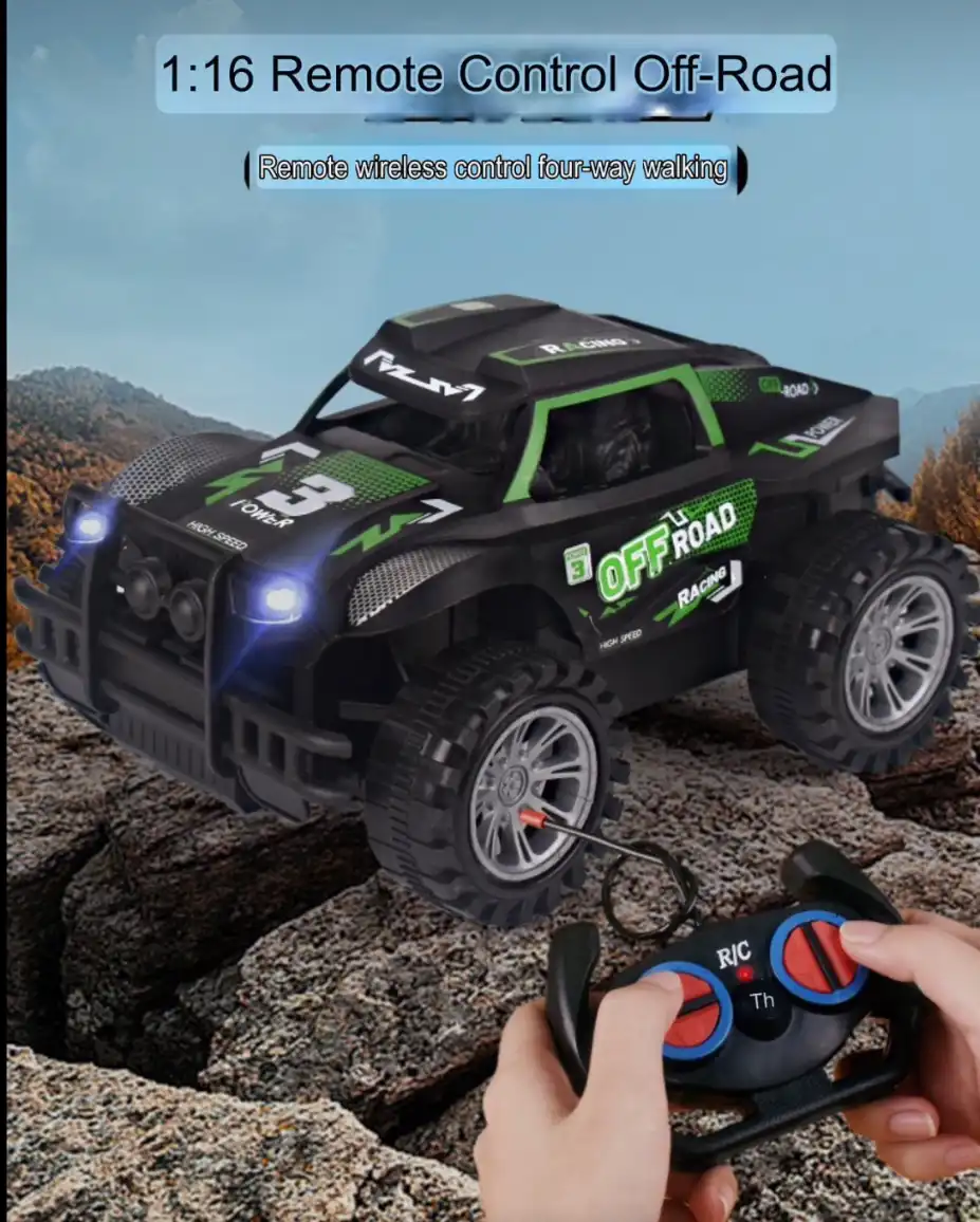 Experience the thrill of rugged terrain with this 1:16 scale Remote Control Off-Road Vehicle. Designed for durability and performance, this “Climber” features aggressive off-road tires and a high-clearance chassis, making it perfect for indoor and outdoor adventures. With its sleek black and green racing aesthetic, bright LED headlights, and responsive 4-way wireless control, it’s an ideal choice for hobbyists and young racers alike.